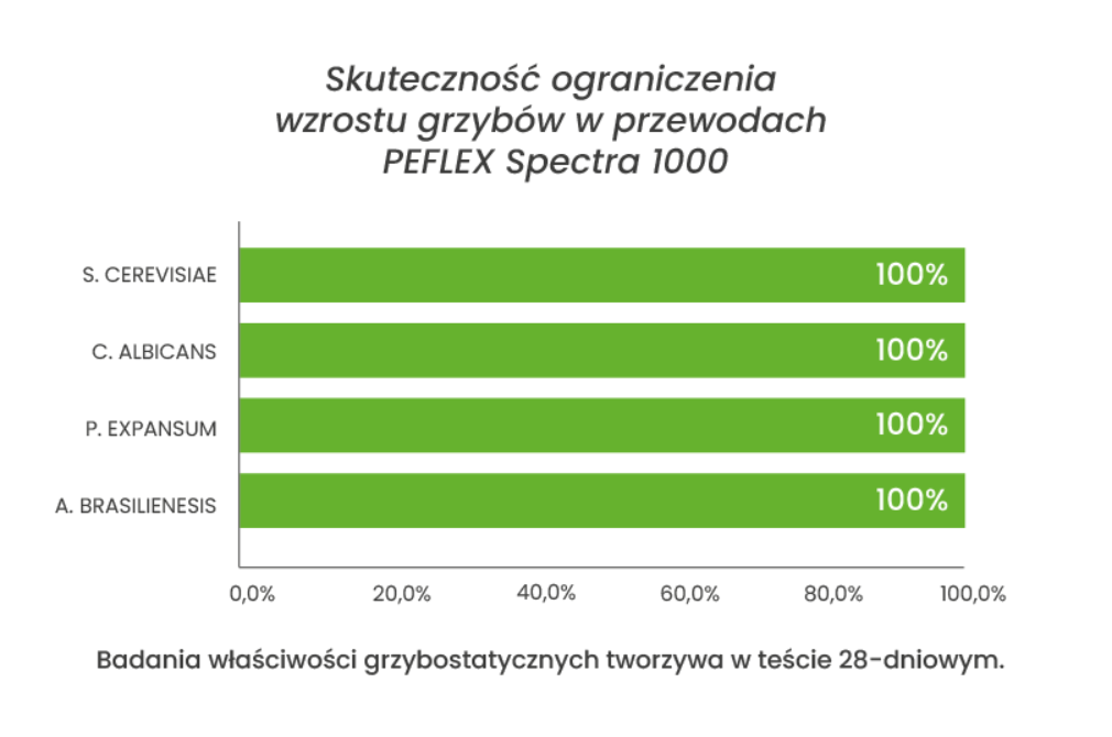 Dwuwarstwowe rury wentylacyjne PEFLEX wykonane są z wysokiej jakości tworzywa PE-HD i wyposażone w innowacyjną powłokę wewnętrzną SPECTRA 1000 o bardzo wysokich właściwościach bakteriobójczych i grzybobójczych – jako jedyna na rynku z potwierdzonymi badaniami. Powłoka zawiera srebro, miedź oraz inne związki aktywne mikrobiologicznie (150 ppm srebra), zapewniając trwałą, bezterminową ochronę bez migracji substancji i ryzyka powstawania odporności mikroorganizmów.