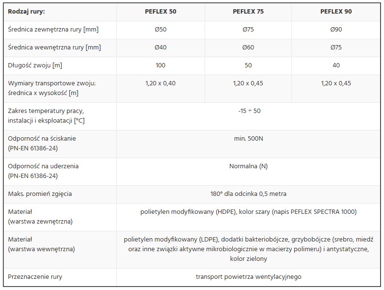 Rura wentylacyjna PEFLEX z powłoką SPECTRA 1000 o najlepszych właściwościach bakteriobójczych i grzybobójczych (sięgających 100%) na rynku. Powłoka wewnętrzna posiada dodatki srebra, miedzi i innych związków aktywnych mikrobiologicznie (ulepszony odpowiednik rury 150 ppm). Kanał wentylacyjny dostępny jest w wariantach o średnicy Ø50, Ø75, Ø90mm oraz długościach przewodu 40m, 50m oraz 100m z I gatunku surowca i posiada wszelkie niezbędne atesty.