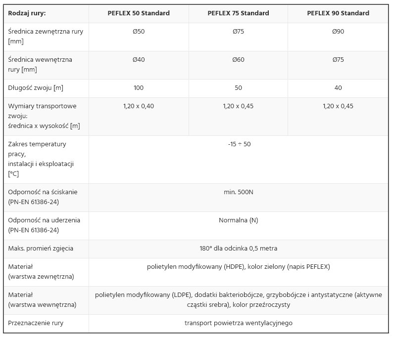 Dwuwarstwowe rury wykonane z wysokiej jakości tworzywa PE-HD posiadają gładką, antystatyczną powłokę wewnętrzną z dodatkami bakteriostatycznymi i grzybostatycznymi (m.in. srebro i miedź), które ograniczają rozwój mikroorganizmów oraz osiadanie kurzu. Zapewnia to higienę instalacji i długotrwałą ochronę niezależnie od temperatury i wilgotności powietrza.