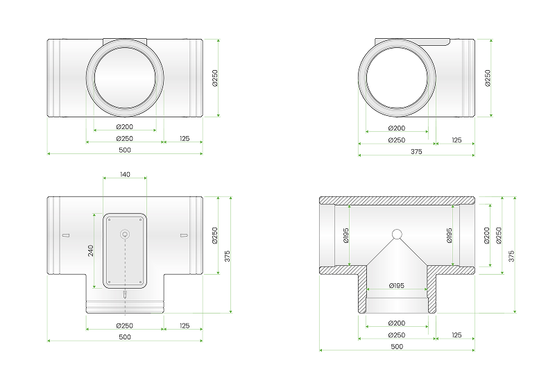 Każdy z trzech króćców pozwala na podłączenie kanałów o średnicach Ø160 mm lub Ø200 mm, co daje pełną elastyczność konfiguracji instalacji.
