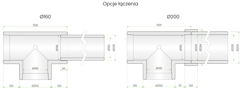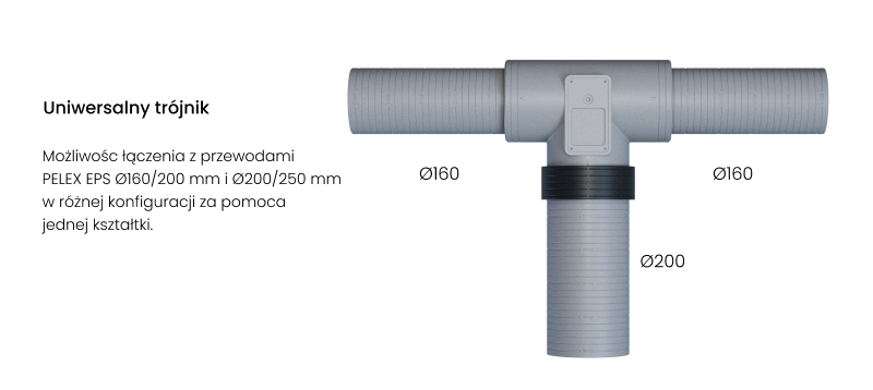 Trójnik łączy się z rurami EPS Ø200 mm za pomocą elastycznych muf EPP, co zapewnia szybki i szczelny montaż na wcisk – bez konieczności stosowania klejów czy innych środków uszczelniających.